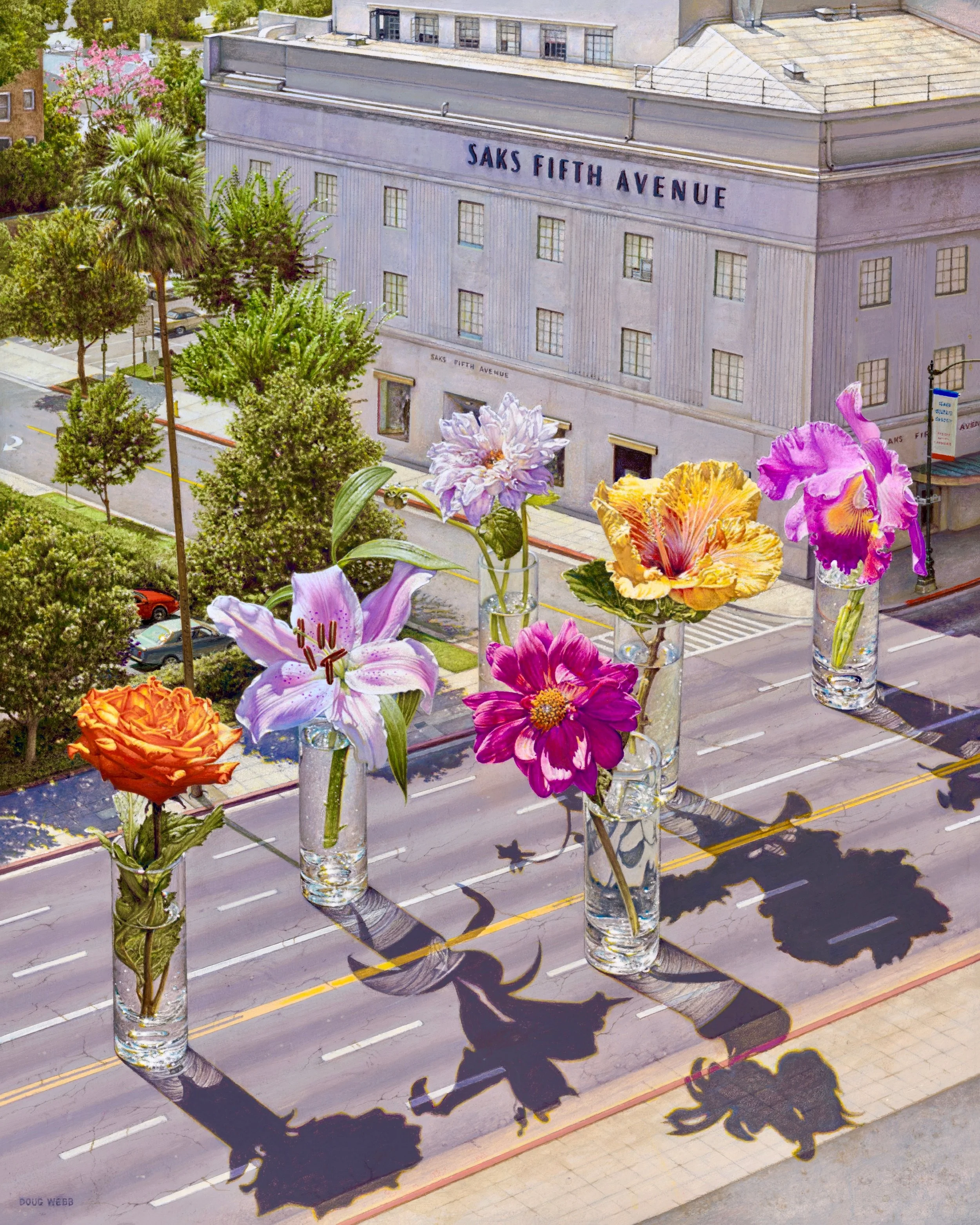 “My medium is acrylic paint on linen canvas. I isolate each transparent wash with a gel medium glaze to create texture and depth. My ideas come to me as visions. Many times these visions come from the hypnagogic state known as the unconscious middle zone between awake and sleep. The strength of my work lies in the recognition of opposites - the humdrumness of urban living with the dream of utopia based in nature. With the use of composite imagery and shifts of scale between everyday scenes, situations and common objects, I weave a tapestry blending threads of satire, irony, conflict and hope.