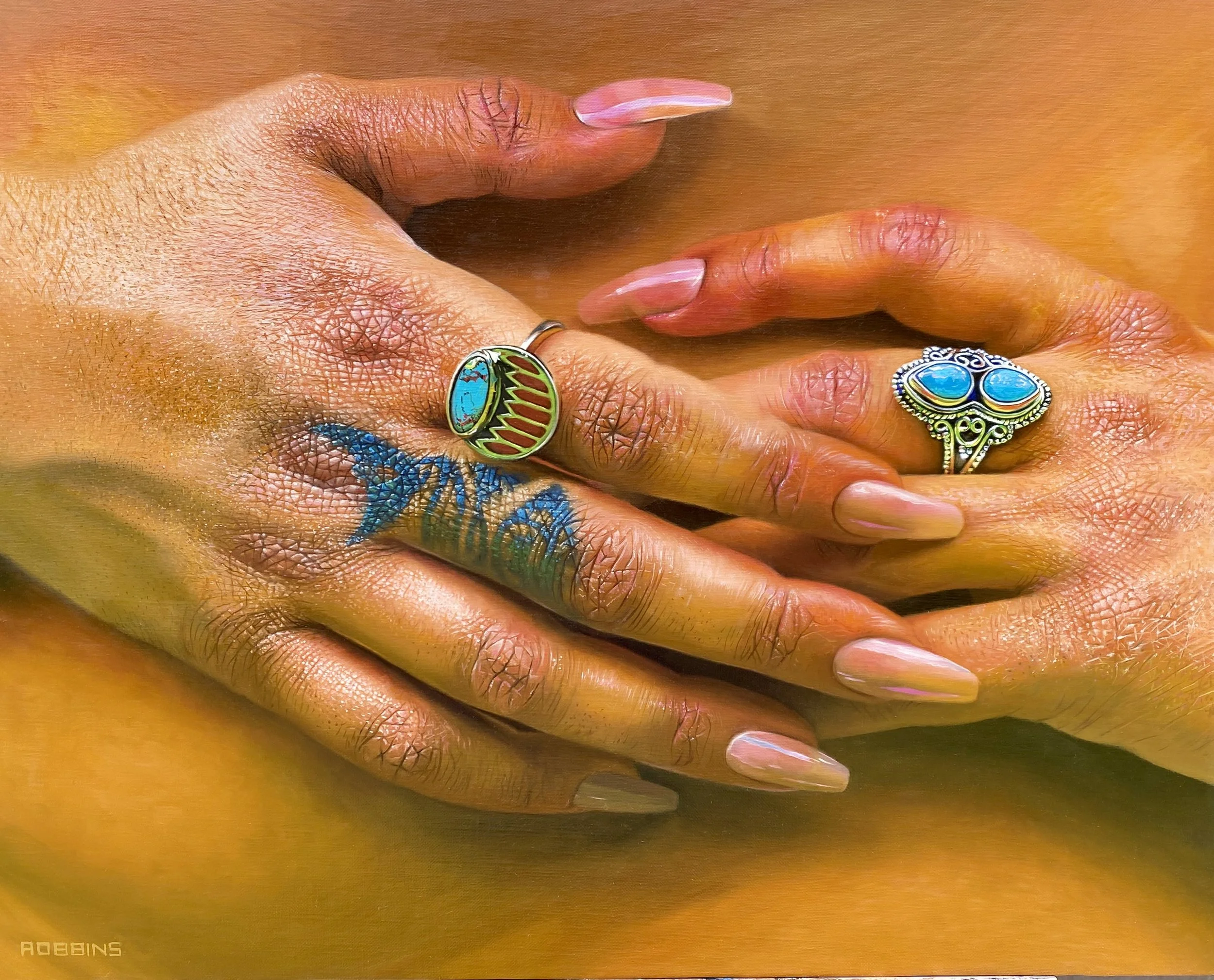In 2008, after having grown tired of creating for others, Robbins leveraged her successful graphic design background and began photographing and painting clients and friends. She refined her voice for two years, culminating in a solo show of eight 6'x4' portraits of figurative couples called "8 Portrait Peaces." exhibited at the Brill Gallery in North Adams, MA. Two of these paintings were accepted into the Royal Portrait Society's Annual non-member exhibition at the Mall Galleries in London in 2010 and 2011.